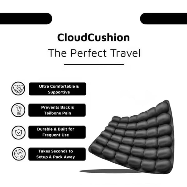 The CloudCushion features 64 Air Cells that contour and hug your bottom, redistributing pressure for unparalleled comfort and support. Even on the most thinly padded, uncomfortable seats, sitting on this cushion will feel like you're on a bed of soft, plush clouds, allowing you to sit comfortably for hours without back, bottom, or tailbone pain.